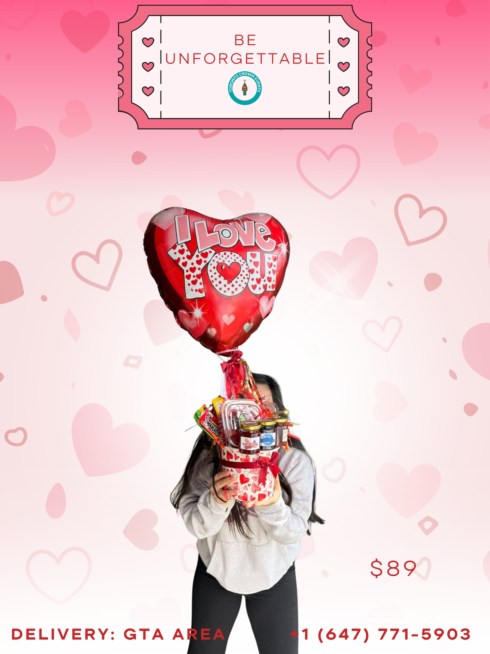 Each bouquet features three signature jars of artisanal Chamoy (Mango, Bubbalo, and Tamarind), perfectly paired with a variety of classic Mexican candies like Pulparindo. Topped with a vibrant "I Love You" or modern heart graphic helium balloon, this set is finished with elegant crimson ribbons and a decorative heart-themed base. Whether it is for a partner, a best friend, or a family member, this spicy surprise from Toronto Crown Events is guaranteed to stand out.